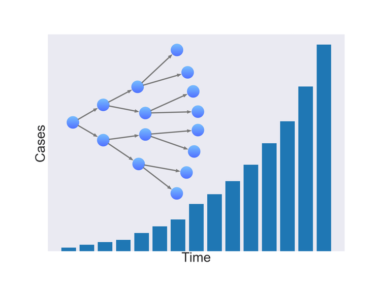 It’s easy to see how this pattern of growth characterises the spread of a pandemic. If a carrier infects two people and they infect two more and so on, the total number multiplies exponentially, as the left hand side of this image shows. If instead each person was to infect ten, the growth would, of course, be far more rapid. In the case of COVID -19 the average number of people a carrier infects is thought to be between 2.0 and 2.5. For seasonal flu the figure is lower.