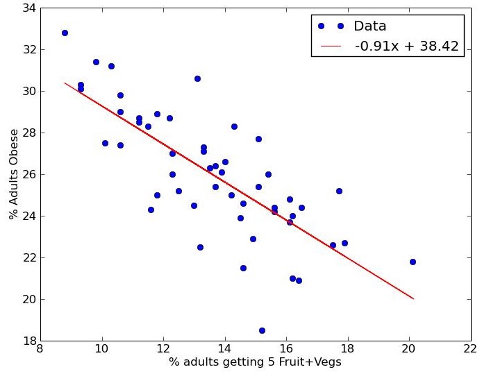 Mathematically, a line can be found that fits the scatter of points with the least amount of deviation. The steepness of the line can be calculated to give an indication of how important the link is. Some individual cases will lie above and some below this line. Dots below the line could be used as examples to show that some groups are not obese even though they eat little fruit and veg. Propagandists may be tempted to select individual cases in order to mislead people about a trend. For public policy purposes, overall trends are vitally important.