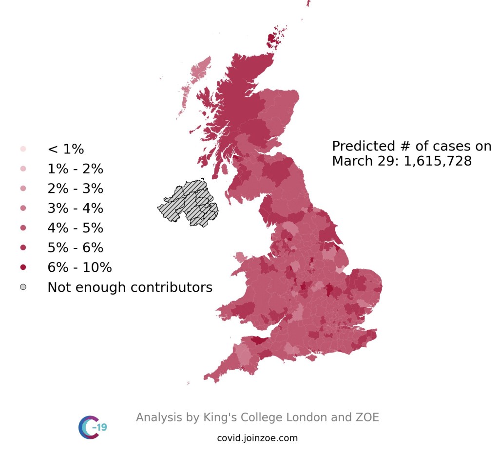 By this means they were able to estimate which of the 400,000 people reporting their various symptoms had actually had the infection. Some probably had the COVID infection, some had something else. From this they were able to estimate the percentage of the population that had had the infection, even though the test for this is still not widely available. Because the number of people in the study is so large they were even able to estimate the likely number of infections in each region of the UK and produce this map.