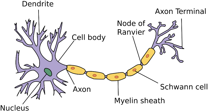 Signals pass from one neuron to the next from the axon terminal. By connecting up in this way, groups of neurons form networks or ‘circuits’. The myelin sheath (in yellow) acts as a kind of insulation material which increases the speed of the electrical signal as it passes along the neuron.