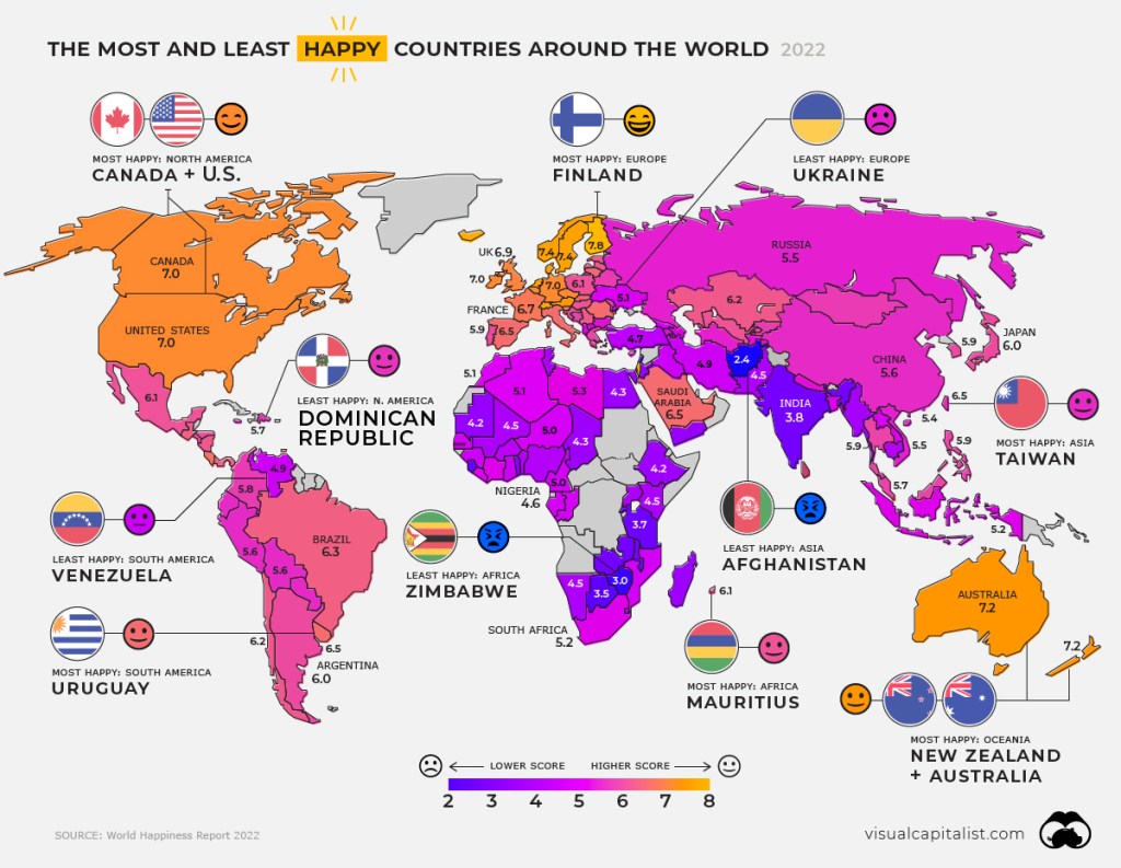 Finland has topped this chart for six years in a row. “What puts Finland at the top of the happiness chart and keeps it there, year in, year out?” was the obvious question put by Patrick in a discussion.  The Finnish government points out that the World Survey measures overall contentedness with life, rather than momentary pleasure. It relates its high rating to its “infrastructure of happiness”, common to Nordic countries, in which social systems “support democratic governance and human rights, not to mention free education and healthcare”. A Finnish professor who researches well-being comments on a particular characteristic of Finnish people: “when you know what is enough, you are happy.” The Finnish word sisu seems to capture it: “grim determination in the face of hardships” – reflecting an expectation to persevere, without complaining. Others mention the prevalence of music, the arts, sport and abundant nature as important factors.