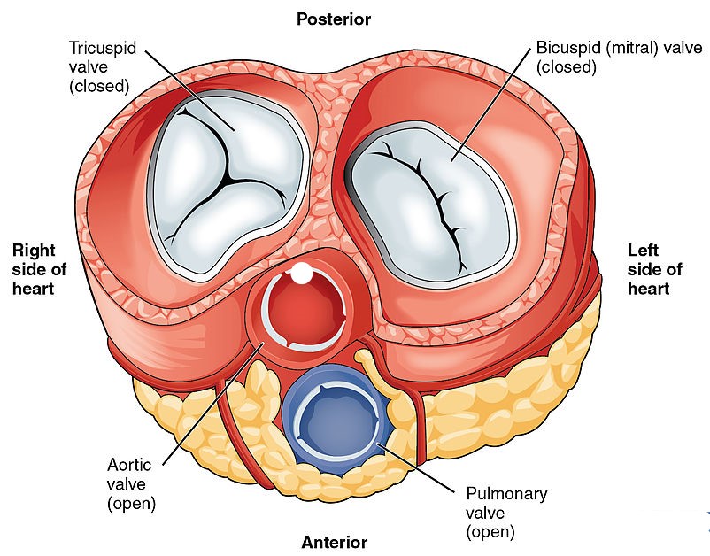 The four heart valves are shown in a cross-section model of a heart in Figure 9. It depicts a moment in the cycle when two valves are closed (white) and two are open (red and blue). Valves are also present in veins to ensure the returning blood, less pressurised, still flows in the forward direction only.