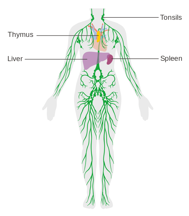 Lymph nodes occur at frequent intervals along the path of lymph vessels. They are bulbous structures around a centimetre across, packed with specialised defence cells called lymphocytes. These are capable of destroying unwanted items brought to them by the cleansing work of lymph fluid – bacteria and viruses for example. It’s one of the many ways in which the immune system combats pathogens.