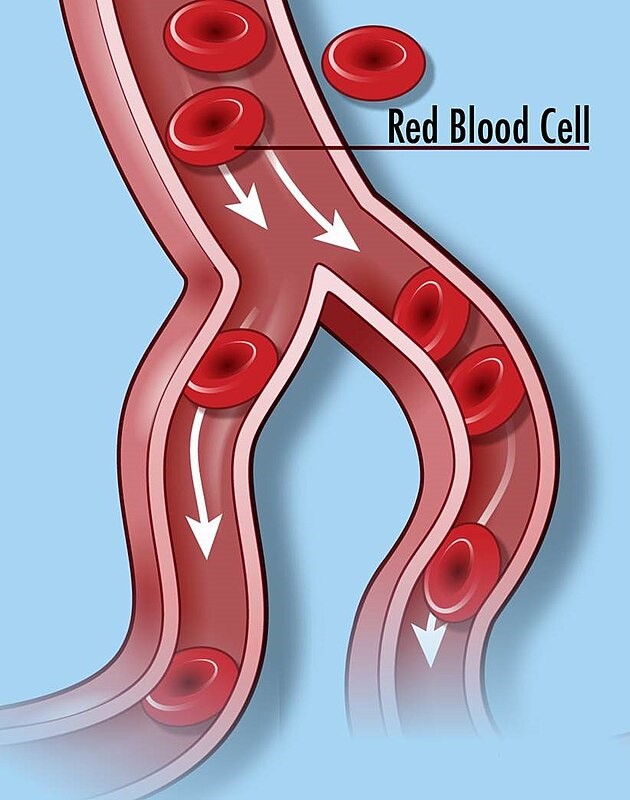 Although blue and red colours are often used to distinguish veins and arteries in diagrams, returning blood, lacking oxygen, is not in fact blue, but simply a darker hue of red than that of arterial blood. Veins gradually merge with one another like tributaries to a river, until they reach the biggest of all – the Vena Cava – which empties into the heart. A separate set of blood vessels then pump the exhausted blood back to the lungs where the red cells get loaded up with oxygen molecules once again, ready for the next cycle.