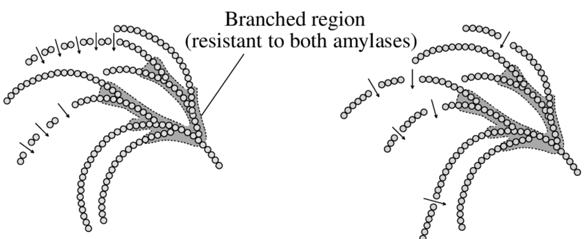 One type of enzyme in saliva, called amylase, breaks up the large, branched molecules of starch, a type of carbohydrate found in rice, pasta and potatoes (see figure 1). Another, called lingual lipase, breaks up molecules of fat. Saliva also helps by lubricating the mouth in preparation for swallowing.