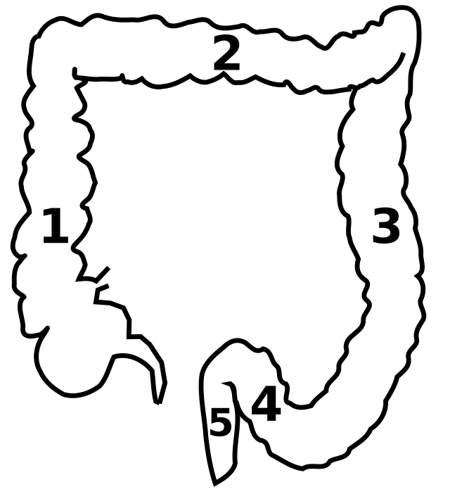 In contrast to the wiggly coils of the small intestine, this part is neatly organised around three sides of a quadrilateral (figure 13), one side ascending (1), one transverse (2) and the other descending (3). Its main job is to solidify the remaining material by removing water.