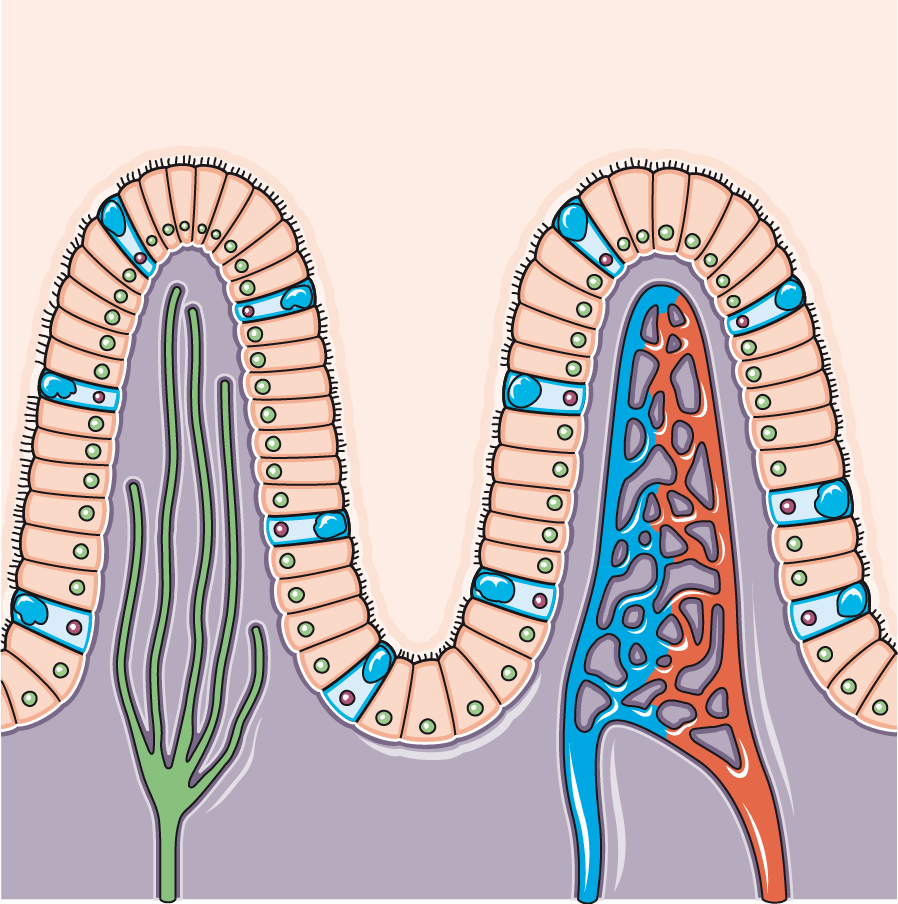 Inside these villi lie the blood vessels (red and blue) and lymph vessels (green) that take up the small molecules from food that have been absorbed through the lining of the gut. It’s from here that these nutrients are distributed to cells throughout the body.