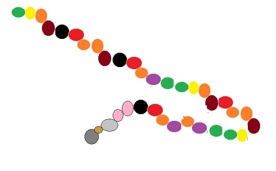 These lipoproteins have a beautifully arranged structure, which solves the transport problem; they are covered in molecules that have two different ends (figure 12). Their heads are water-loving (yellow balls) and their tails are fat-loving (short beige lines). Assembled together in a ball, they provide a coat that encloses the fatty molecules cholesterol and triglycerides (red and green) on the inside, but which itself dissolves comfortably in blood.