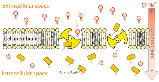 A similar process gets the food molecule out of the other side of the cells that line the gut, and into the cells that line the adjacent blood and lymph vessels, finally releasing them into the bloodstream and the lymph system. The whole process is like a series of diggers, picking up a load in one place, turning around 180° and dumping the load, ready for another digger to do the same until the load reaches its destination.
