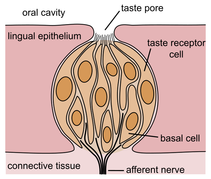 These tiny structures on the surface of the tongue, and elsewhere in the mouth, contain cells with tiny hairs just below an opening (‘taste pore’) through which molecules from food can enter.