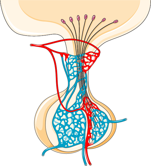 Electrical signals pass along nerves from the hypothalmus into the pituitary gland . These nerves are shown as black lines in figure 5. Here they cause key hormones to be made and secreted into the bloodstream (red arteries, blue veins).