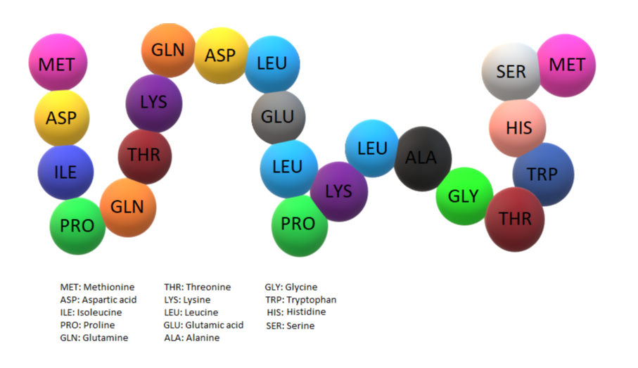 The molecules of protein are, like many key molecules in our bodies, long chains, rather like necklaces with beads linked together in one long thread. Each bead or link of the chain is a small molecule, one of a class of molecules called amino acids. These come in twenty varieties, which gives plenty of scope for constructing all the different kinds of protein we need, by linking together different types of “bead” in different sequences.
