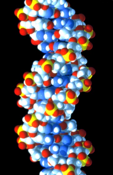 The molecule comprises a backbone made of two helices which repeat regularly along its entire length – a bit like the railings and banister of a spiral staircase. Of itself, this is just a structure, the backbone carries no information of use to the body. The extraordinary power of DNA – the information it carries – lies in the units attached to each of its regular repeats, roughly analogous to the steps on a spiral staircase.