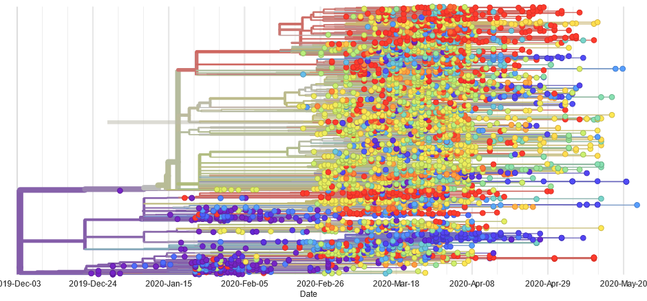 Under normal conditions the human population is rarely overwhelmed by infections. The various defence mechanisms of the immune system usually succeed in combatting unwelcome intruders: viruses, bacteria, parasites and other microbes. The immune system not only protects against familiar bugs but also identifies new mutated versions and adapts accordingly. That’s why we don’t get last year’s flu again. The mutated coronavirus has caused such devastation because it is not only able to transfer itself so easily from one host to another but it does so many days before anyone is aware of symptoms. A random mutation has resulted in the virus being able to survive and spread through sneezes and coughs before any protective measures have been taken to block its progress. One interesting benefit from the rapid mutation rate of the Sars-CoV-2 virus is that it enables us to track the progress of the disease across the world. The virus’s genes evolve at a steady rate of about 2.5 mutations a month The slightly different genes of the various mutants can be analysed in different places at different times. The number of altered bases (or “letters”) in each type of mutant can be used to work out how long has elapsed since the original outbreak in Wuhan. An evolutionary tree can be built up showing how, when and where one mutant strain diverged from its predecessors. The diagram below produced by an open-source collaboration of scientists called nextstrain[i] shows when the various mutants appeared in different countries (for country colours click the link ).