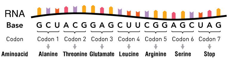Each group of three ‘letters’ in the RNA message spells out the code for one specific amino acid (or ‘bead’ in the necklace}. The diagram shows the letters G C U, for example, correspond to an amino acid called Alanine.