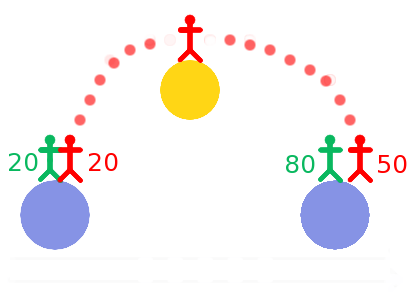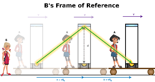 In this diagram, a person “A” is travelling along at high speed compared to her companion “B” who remains stationary outside. Imagine a beam of light shooting up from the floor to the ceiling of the compartment “A” is travelling in and bouncing back again, from a mirror. She would see the light simply shooting up and down from floor to ceiling and back (if it weren’t so fast).