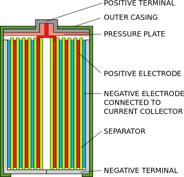 This image is a slice through a typical cylindrical battery (like an AA or AAA in the UK) consisting of alternating layers, rolled up like a Swiss roll.
