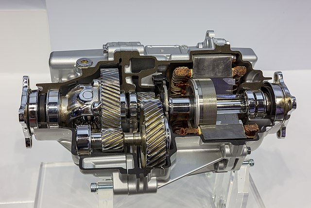 Figure 4 is a photo of a gearbox , showing cogwheels engaging with each other. In this case the teeth are cut diagonally so that they mesh gradually with one another, giving a smoother and quieter operation