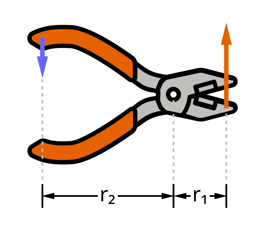A more practical example of a lever is a pair of pliers. Here a large force used to grip and bend a piece of metal or wire is generated by a lesser force generated by your hand, thanks to the greater distance the handle moves compared to the jaws of the pliers. The energy you expend in moving the handle though a larger distance with a small force is greater than the energy consumed in moving a large force though a smaller distance in the jaws.