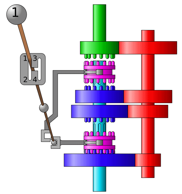 Figure 5 is a simple animation that helps us see how shifting a gearstick in a vehicle causes different pairs of cogs to engage in the gearbox. The red part on the right links to the engine which drives the rotation. Blue and green parts link to the wheels on the road. The purple cogwheel, linked to the gearstick, engages with largest cogwheel (blue) for low gear (1st) and the smallest (green) for top gear (4th).