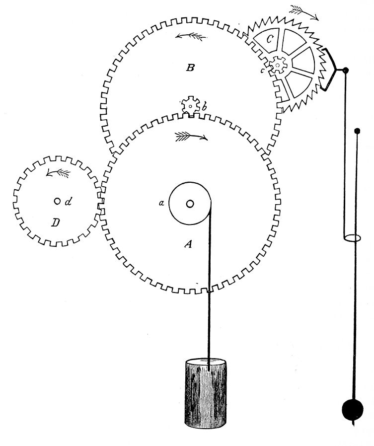 A succession of such gear changes enable the hand of the clock to turn very slowly indeed (figure 12). Each tick of the clog, moves the first wheel on by just one tooth; then this slow rotation is reduced even further as the small cog at the centre, labelled “c” engages with a big cog labelled “B” and is slowed again at the small cog “b”.