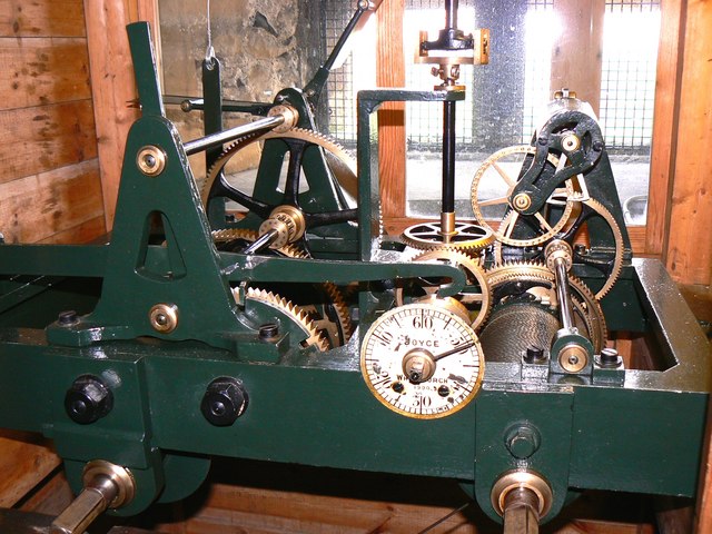 An example of a church clock in Marlborough, Wiltshire is shown in figure 11. A number of very small cogs can be seen engaging with much larger ones. When the smaller one has rotated just once, the larger one may have only turned though a tenth or less of its cycle.