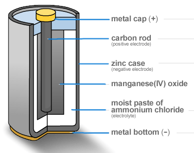 The main materials that make up a battery are the two electrodes and the paste or gel of the electrolyte between them. The type commonly found in torches and other domestic devices have one electrode made of carbon in the shape of a rod running down the centre and the other, forming the outer case, made of zinc. Between the two is a paste which acts as the electrolyte.