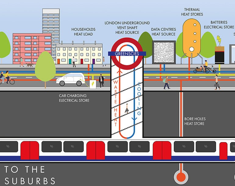 A pioneering scheme in Islington, North London, makes use of waste heat from underground trains by extracting air from an underground railway and bringing it up to a specially designed building on the surface (figure 14). Here, the heat energy in the air is transferred via a ‘heat exchanger’ to circulating water which is then pumped through nearby blocks of flats, in a district heating scheme.