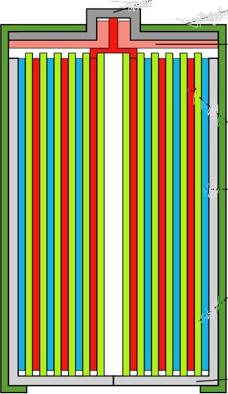 In this cross section of a Swiss roll battery, the blue lines are slices-through the layers of the negative material which all connect to the negative terminal, the plate at the bottom indicated in grey, This is where electrons leave the battery into your device.