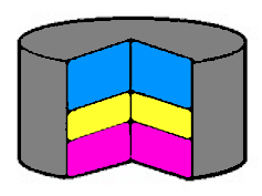 In the simpler design of a ‘button’ battery (Figure 14), electrons leave from the negative layer, coloured pink and enter from the external circuit via the blue layer. The yellow layer is a moist separator. These are commonly used in watches, weighing scales and other devices.