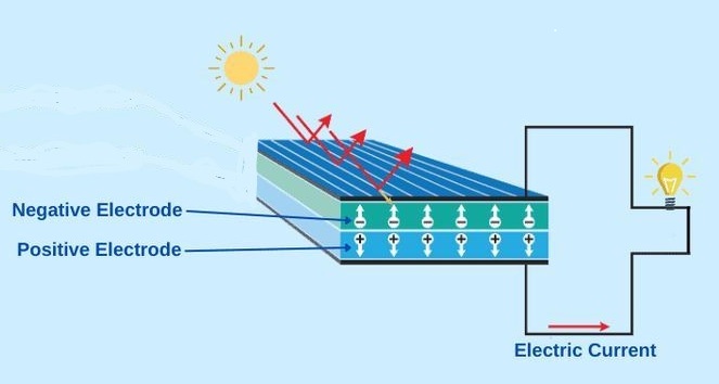 When a voltage is applied across them, these free electrons move as an electric current. In effect, energy from the Sun gets transformed into electrical energy.