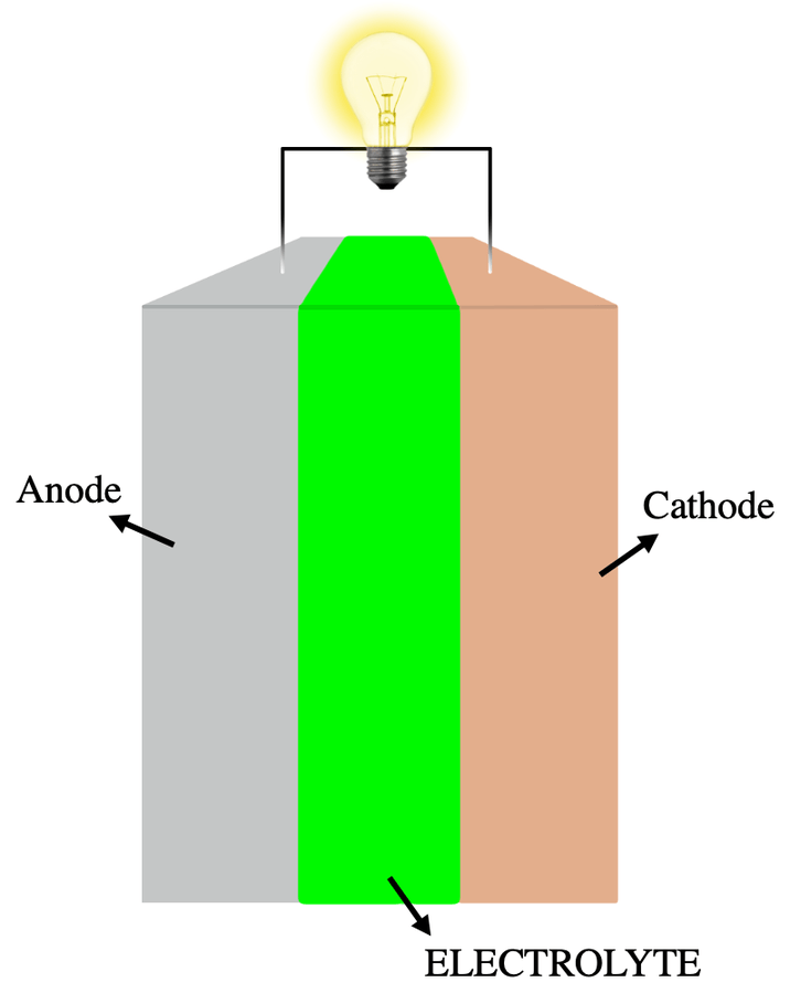 In its basic form, a battery consists of two dissimilar metals, linked to its + and – terminals (called cathode and anode). These are separated by a substance that can carry electrical charges from one metal to the other (called an electrolyte). Strictly speaking, one of these is called a cell; a battery is a collection of these linked together, much as a military battery is a collection of weapons.