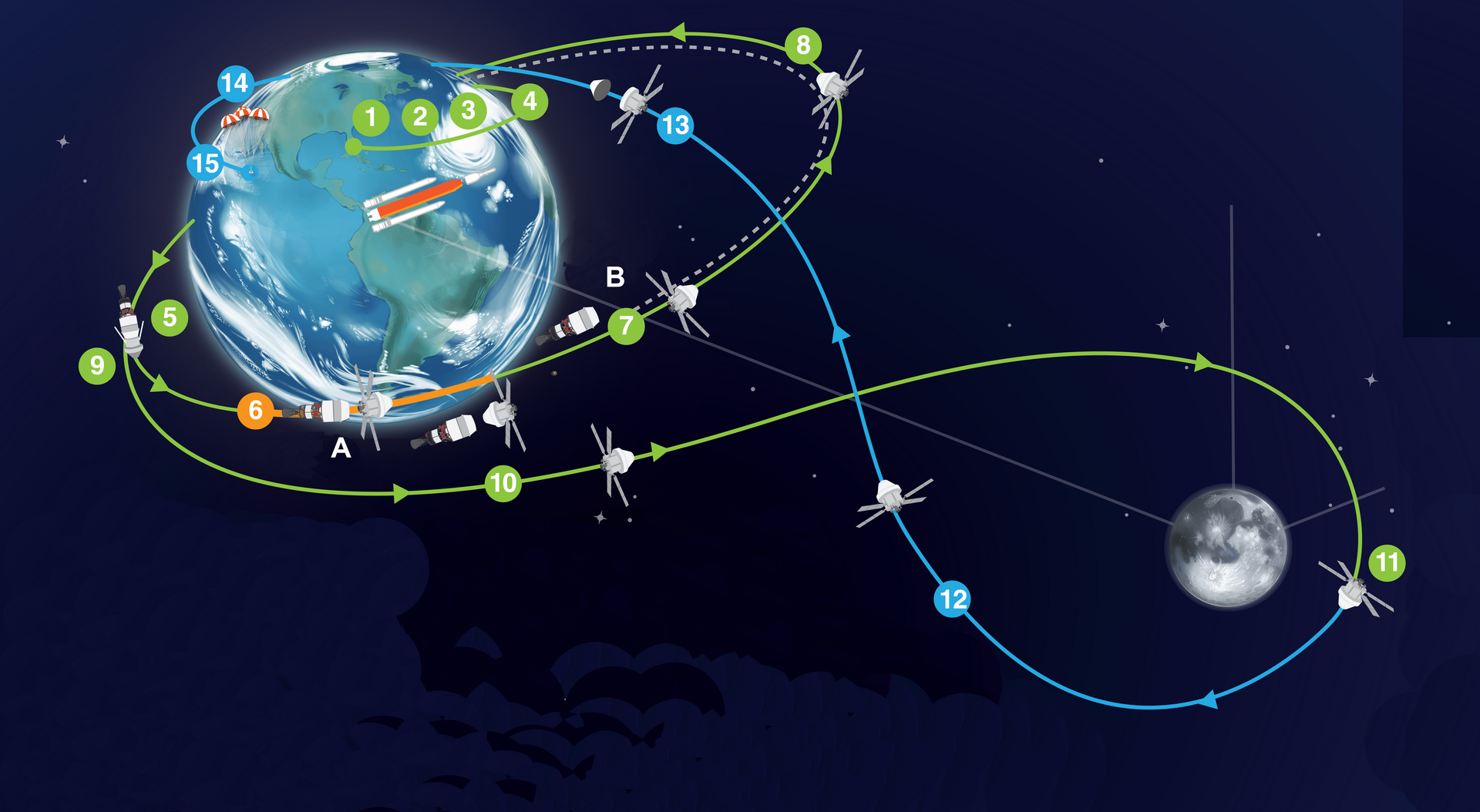 The journey is traced out in figure 3 with key moments indicated by numbers. Position 1 marks the launch; the rocket boosters are jettisoned soon after at position 2. By position 5 the vehicle is in high orbit and at 7 its final propellent-containing module has been jettisoned. From here on the Orion vehicle with the crew aboard was on its own. It orbited the Earth once for a couple of hours so that systems could be checked, then underwent an important ‘burn’ at position 9 using thrusters in the service module attached to the crew module. Thereafter the trajectory was essentially determined by the combined forces of gravity of the Earth and Moon, with a little occasional help from small thrusters in the service module. The long journey ahead took four days, with the craft passively following the laws of gravity.