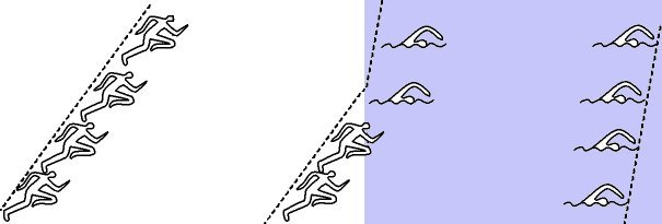 It’s refraction, the bending of a wave front when it hits a boundary that is in play here. The diagram below uses an analogy to explain why this happens. The runners to the left present a straight-line front travelling at an angle to the water that lies ahead (mauve). The front wave moves more slowly in the mauve area, the pace of swimming rather than running. The effect is that the front of the wave (dotted line) changes direction. Light waves travel more slowly in glass or water than in air. As result the front of a light wave changes direction when it hits a different medium, like glass, at an angle.