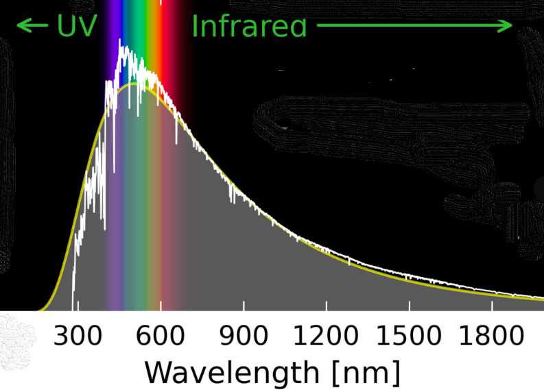 The jagged white line in the diagram shows just how much energy the Sun radiates over a range of different wavelengths. The amount of energy is depicted along the vertical axis and the wavelength along the horizontal one. You can see that the peak of the white line (i.e. the greatest energy) in the graph occurs for visible light, where the spread of colours from violet to red is shown. So the main type of radiation from the Sun is what we see as light, in all its colours. A considerable fraction, however, is also radiated that is not visible to us; it lies beyond the red zone, in the infrared range (which we experience as heat) and below the violet in the ultra (UV) range