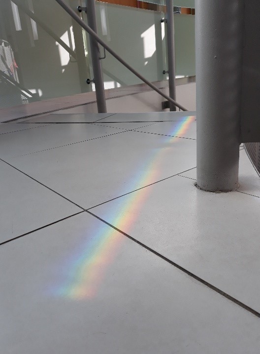 The arresting sight of sunlight on a bright day spreading its colours across a shop floor has led us to explore some of the most fundamental ideas in physics: the nature of light, the meaning of colour, the interaction of light with solid matter. A beautiful sight with beautiful theories to explain it.