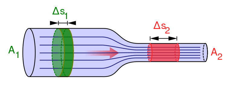 This has the obvious implication that fluids must speed up when they are constrained in a narrower space (red), in order for the same quantity to get through, each second, as in the wider space (green).