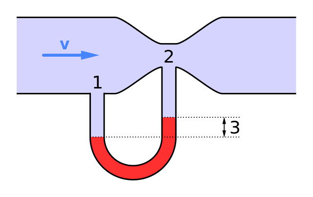 This idea is intuitively simple, but it has a much less intuitive consequence. If the fluid flowing from the wider section speeds up, there must be a force making it do so. In other words, there must be greater pressure in the slow-moving section accelerating the fluid into the fast-moving section. I always had difficulty getting my head around this idea at school– it seemed more intuitive to me that the pressure would be the same everywhere in a flowing fluid.