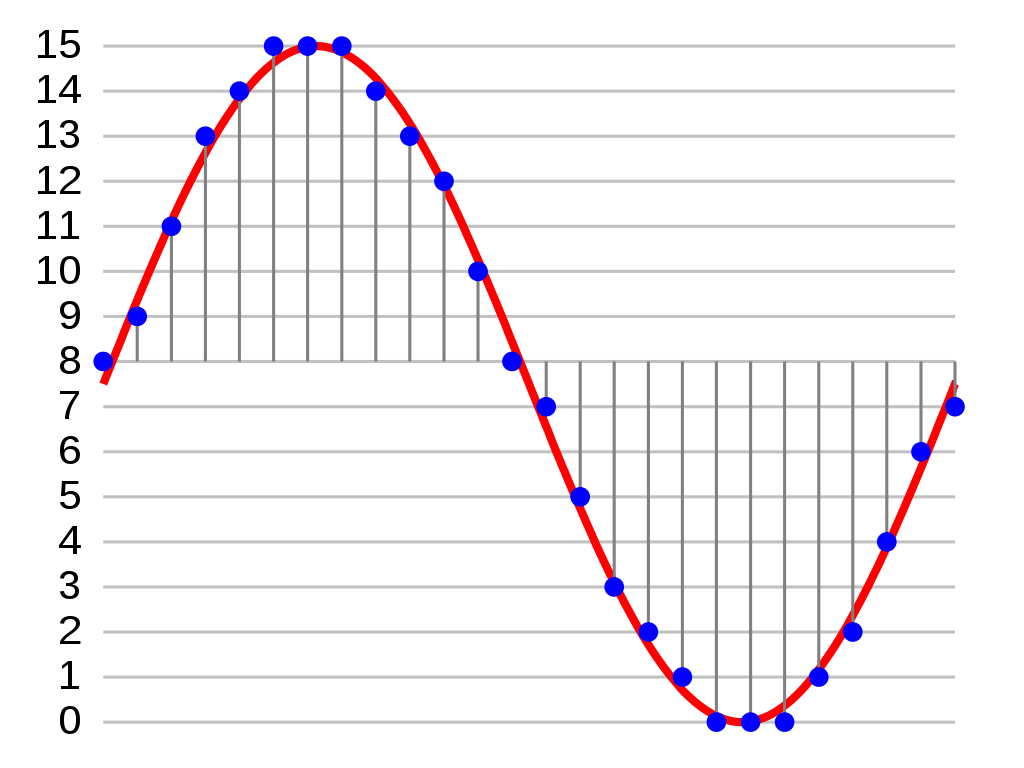 In figure 4, a series of numbers (the height of each blue dot) approximates the shape of a sound wave (red). In this way, a sound wave can be stored in a computer as a sequence of numbers. It’s quite amazing that something we experience as complex and aesthetic as music, can be stored as numerical information on a computer and reproduced at will with minimal distortion.